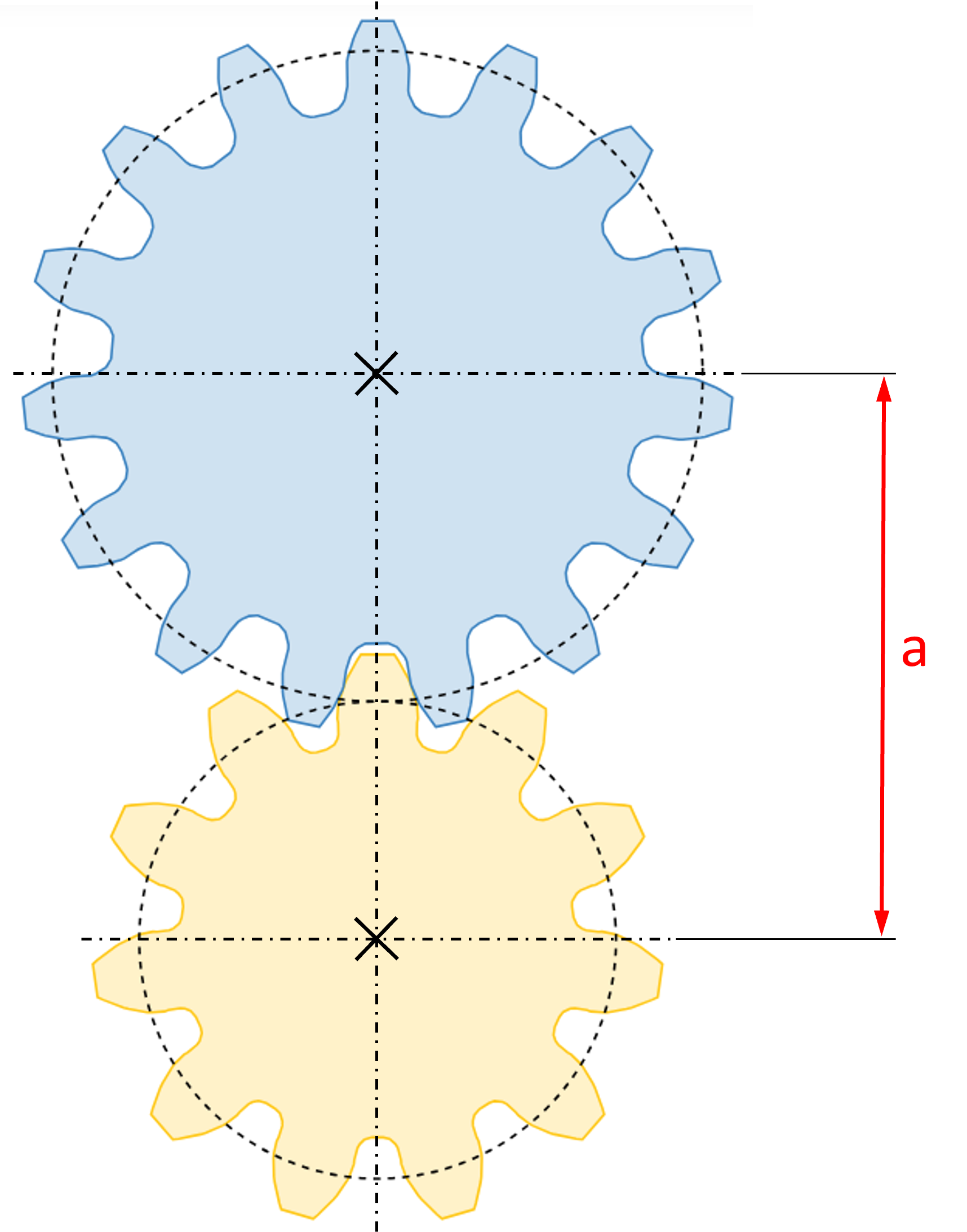 The center distance is defined as the smallest distance between the axes running through the centers of pinion and wheel. The symbol a is often used for the center distance. In general, the center distance is calculated from the sum of the working pitch radii: