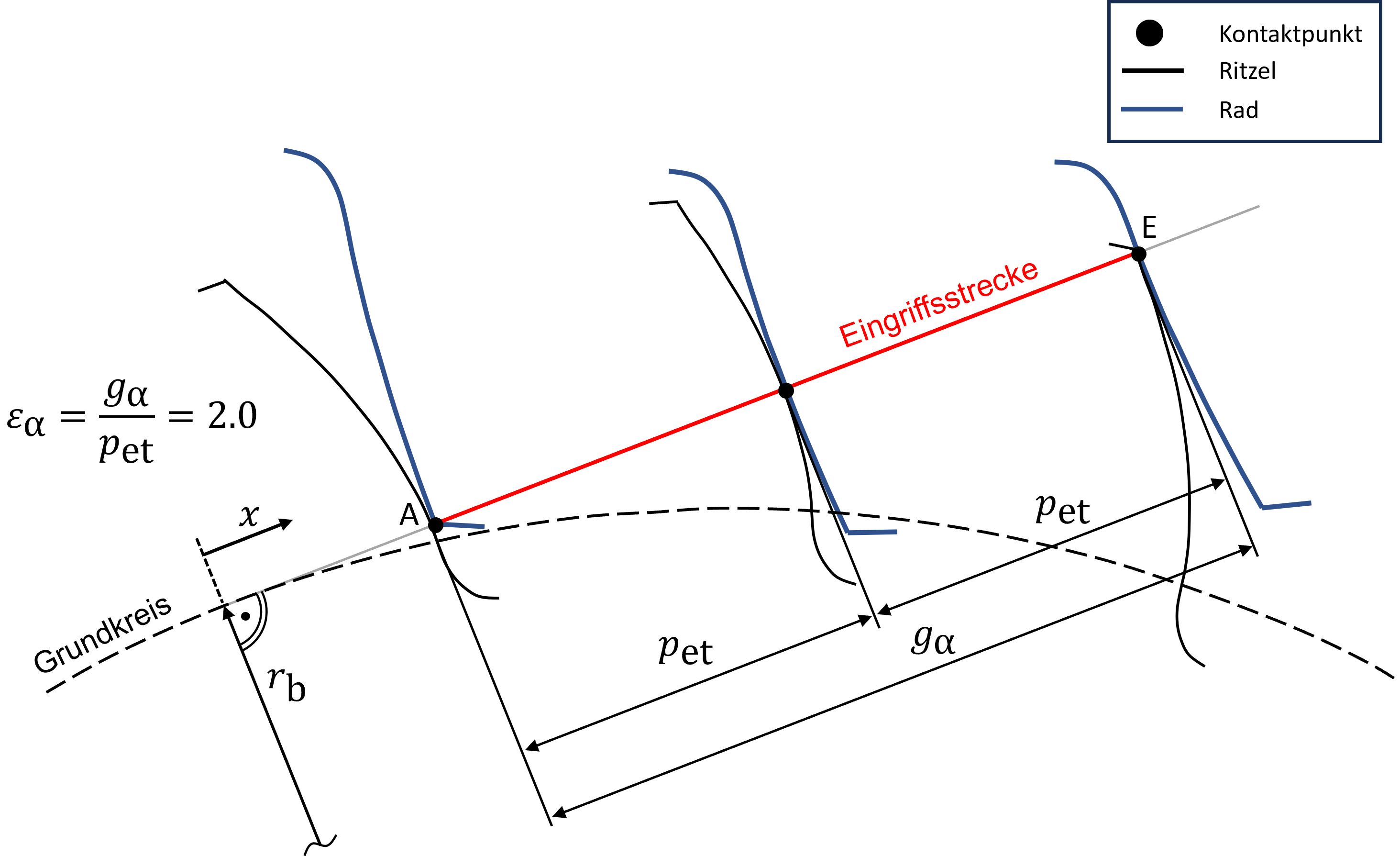 In Fig. 1, the gearing has been designed so that there are exactly three contact points on the line of action. The first contact point lies at point A, the second contact point is exactly in the middle of the path of contact, and the third contact point coincides with point E. At the illustrated instance of time, a pair of teeth engages at point A while at the same time a pair of teeth leaves the contact at point E. Thus, for a brief moment, three pairs of teeth are engaged. If the gears now rotate a small increment further, two pairs of teeth remain in contact. On average, exactly two pairs of teeth are in contact in the illustrated transverse section, so the transverse contact ratio is εα=2.0. For non-integer values of the transverse contact ratio, such as for the range 1.0 <= εα <= 2.0, which is highly relevant in practice, alternately one or two pairs of teeth are active simultaneously, depending on the current position in mesh of both mating gears.