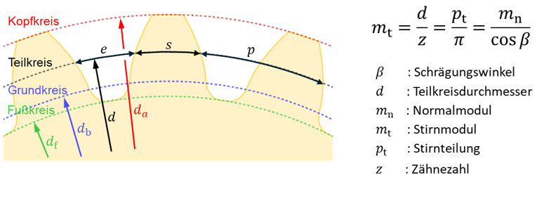 The module is among the most important gear dimensions for spur- and helical gears. The module represents the distance between the teeth, which is also referred to as the pitch. The pitch is the distance between two consecutive right or left flanks on the pitch circle (see figure). Even if the reference diameter d is a rational number, the pitch of the teeth in the circumferential direction is an irrational number (due to multiplication with π). Therefore, unlike in English-speaking countries, it is not the pitch (=d/z * π) that has become established as the standard parameter, but the module (=d/z). For helical gears (β≠0), a distinction must be made between the module in the transverse plane mt and the module in the normal plane mn. The module can also be regarded as a measure of the size of the gear's teeth, which is why gears with large or small teeth are also referred to as large-module or small-module gears. The tooth height is usually specified in relation to the module.