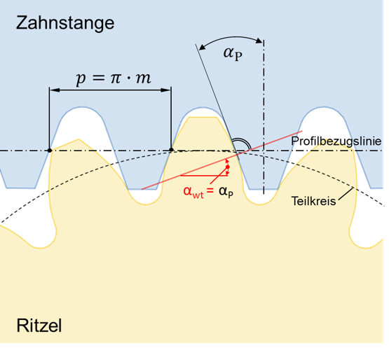 Fig. 1: Transverse section of the gear mesh between the gear and the generating rack (tool). In the special case illustrated here, the profile shift is zero (i.e., x=0), which is why the datum line rolls directly on the reference circle (datum line = generating working pitch line). The working pressure angle between the pinion and the tool profile (rack) is equal to the profile angle of the tool flank (αwt=αP).