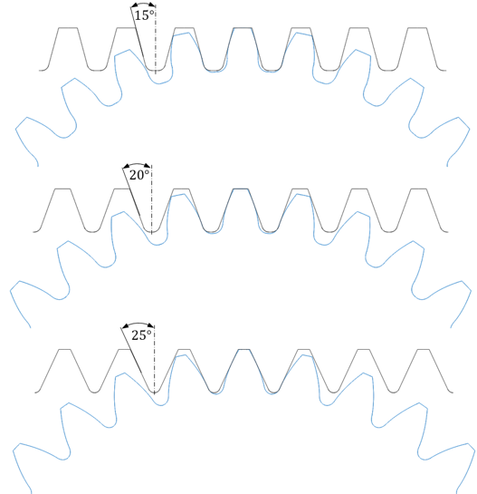 Fig. 2: Tooth shapes when manufactured with racks of the same tooth height but with different pressure angles.