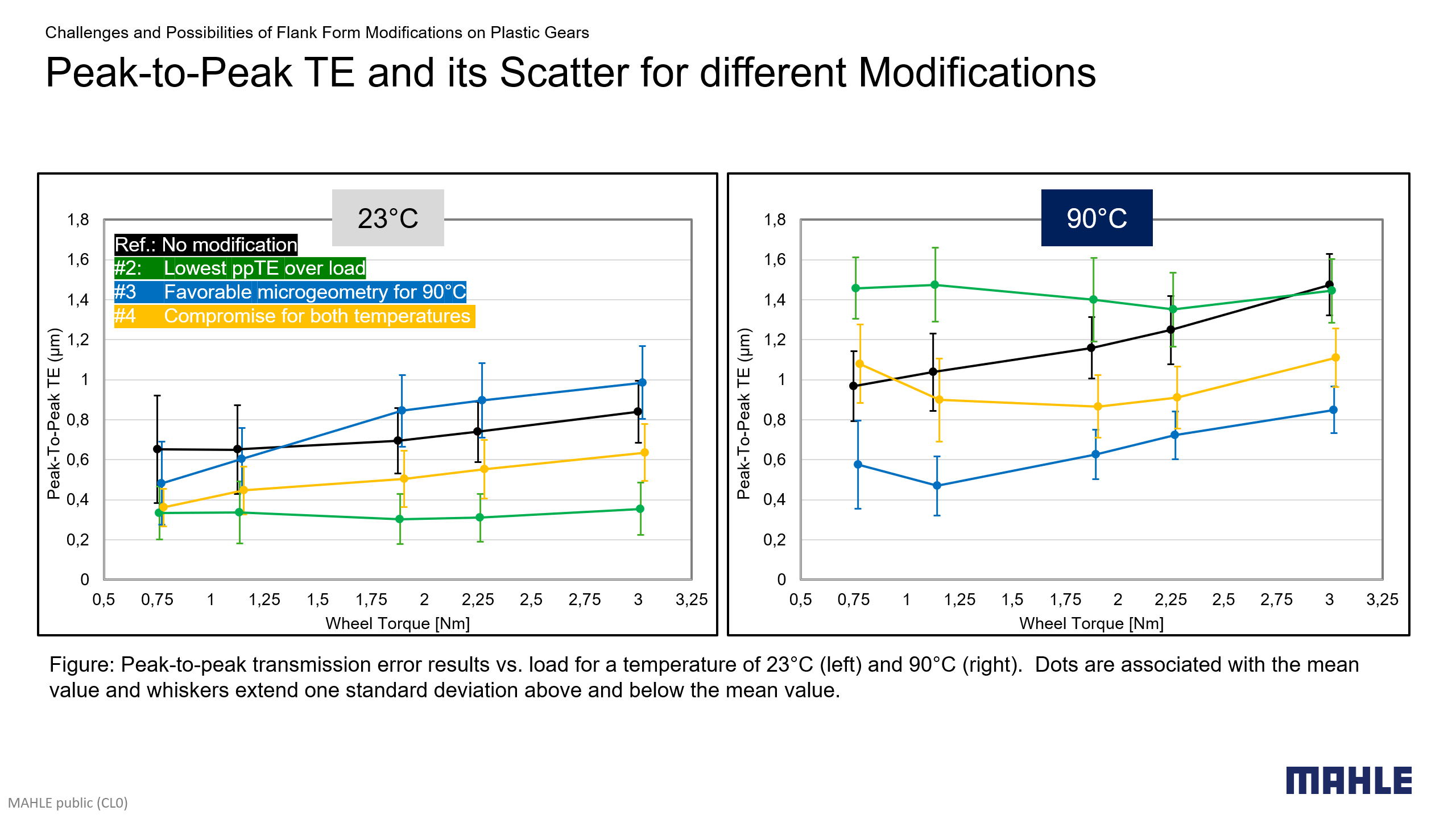 Different micro-geometries (summarized in Tab. 2) were investigated for 23°C and 90°C. Modification #2 is a micro-geometry found by torque-weighted optimization (minimum RMS ppTE over all torques) at 23°C using MimEar-VarAna and is considered a suitable compromise for the analyzed load range. Modification #3 is the result of the similar process but for 90°C. Consequently, modifications #2 & #3 exhibit the lowest transmission errors across the entire load range at their respective temperatures. However, micro-geometries optimized for only one temperature perform considerably worse at other temperatures. Modification #4 demonstrates a more favorable compromise, achieving satisfactory ppTE values at both temperatures. Interestingly, even the uncorrected gear mesh “Ref.” performs better than temperature-specific optimized modifications used at the respective other temperature. This underscores the need to consider temperature changes in micro-geometry optimization.