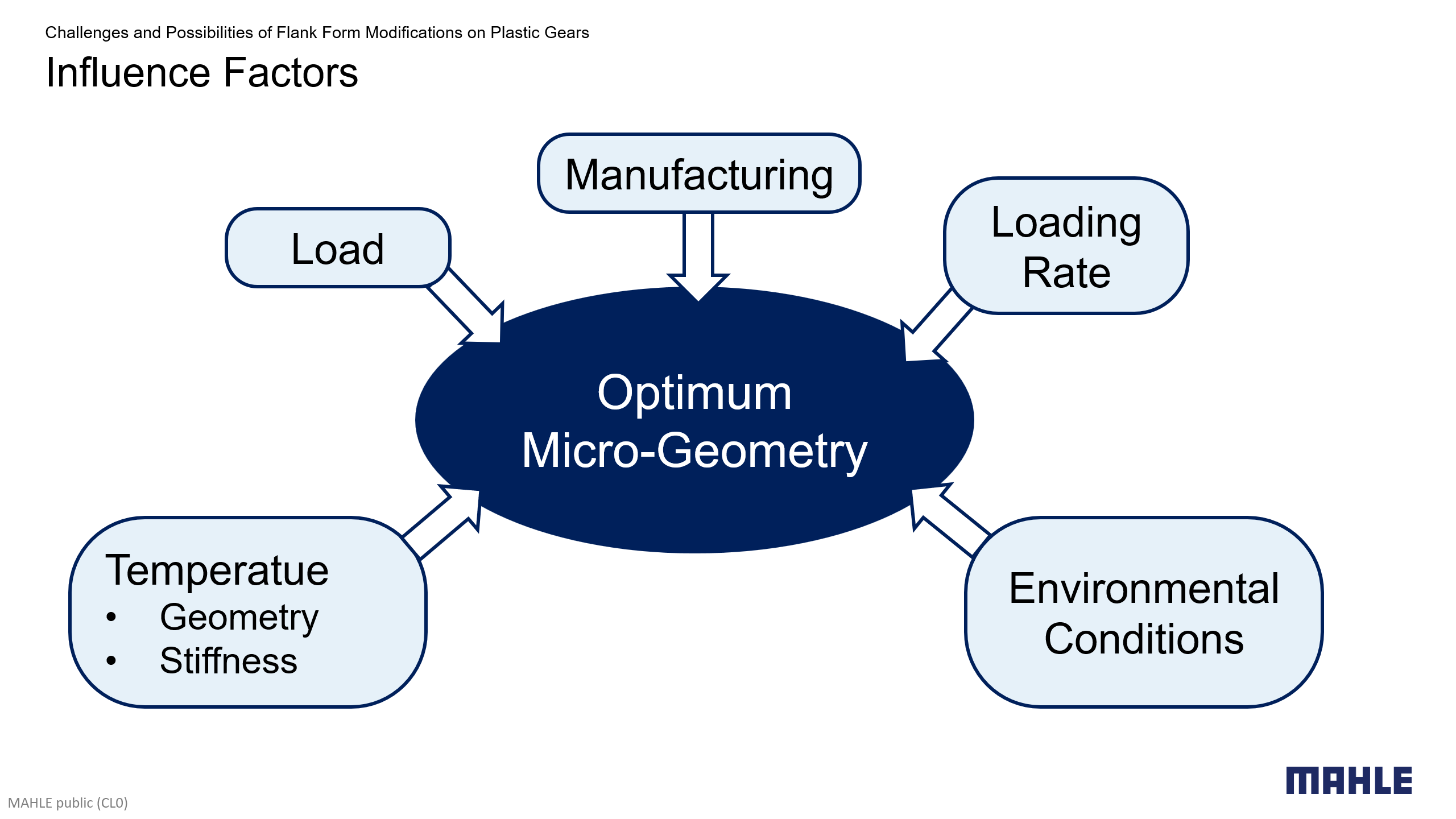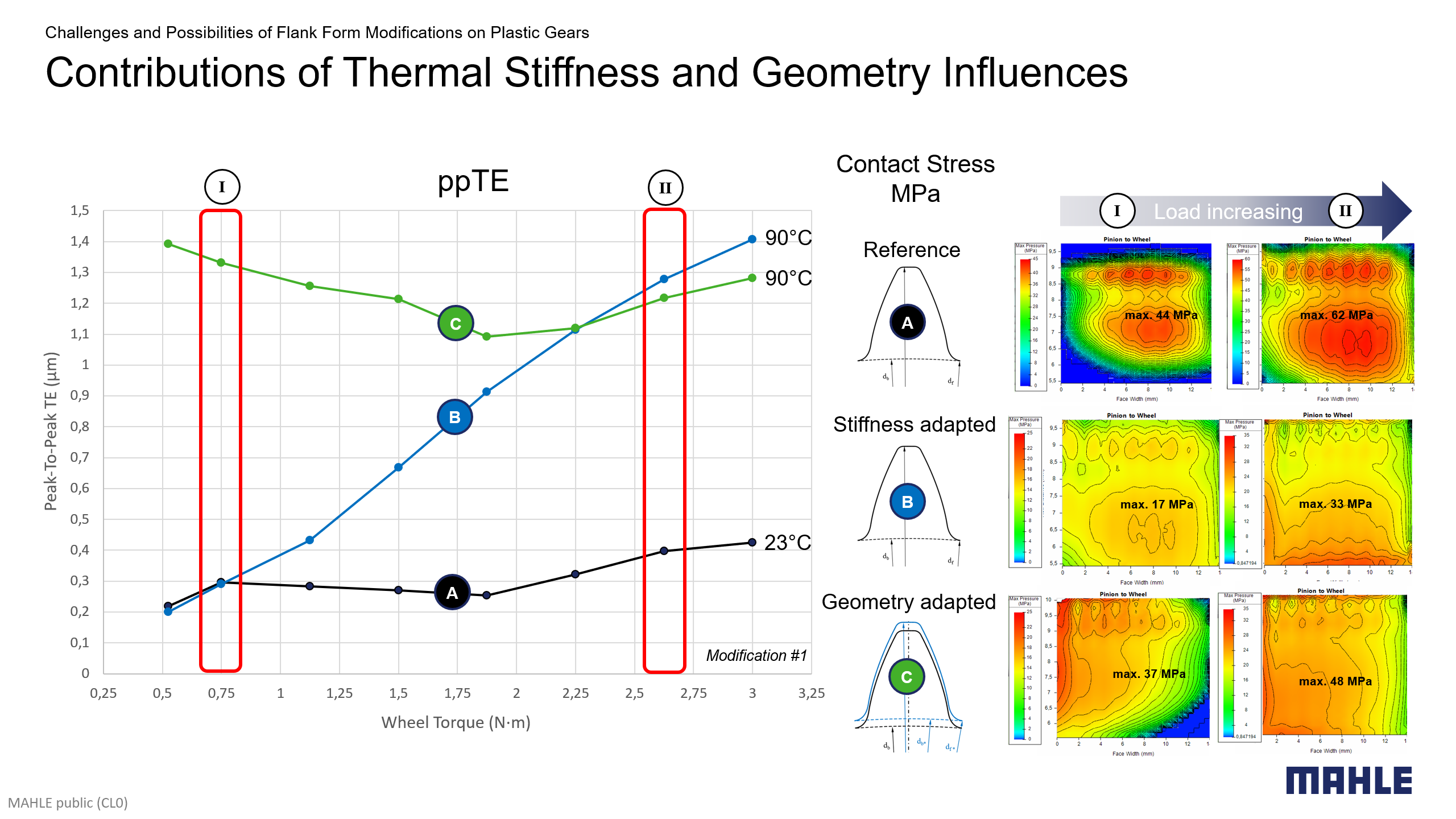 Compared to steel gears, the micro-geometry design for plastic gears requires a more comprehensive consideration of the influencing factors. Particularly thermally induced stiffness- and form deviations are key factors. Designs with higher lead crowning generally result in a narrower ppTE scatter, but this comes at the expense of a generally higher level of ppTE values. Micro-geometries optimized for a specific temperature may perform unacceptable under other conditions. Especially for helical gears, temperature-induced changes in helix angles lead to unfavorable effects on contact patterns and transmission errors. To minimize thermal influences in particular, the following is recommended: