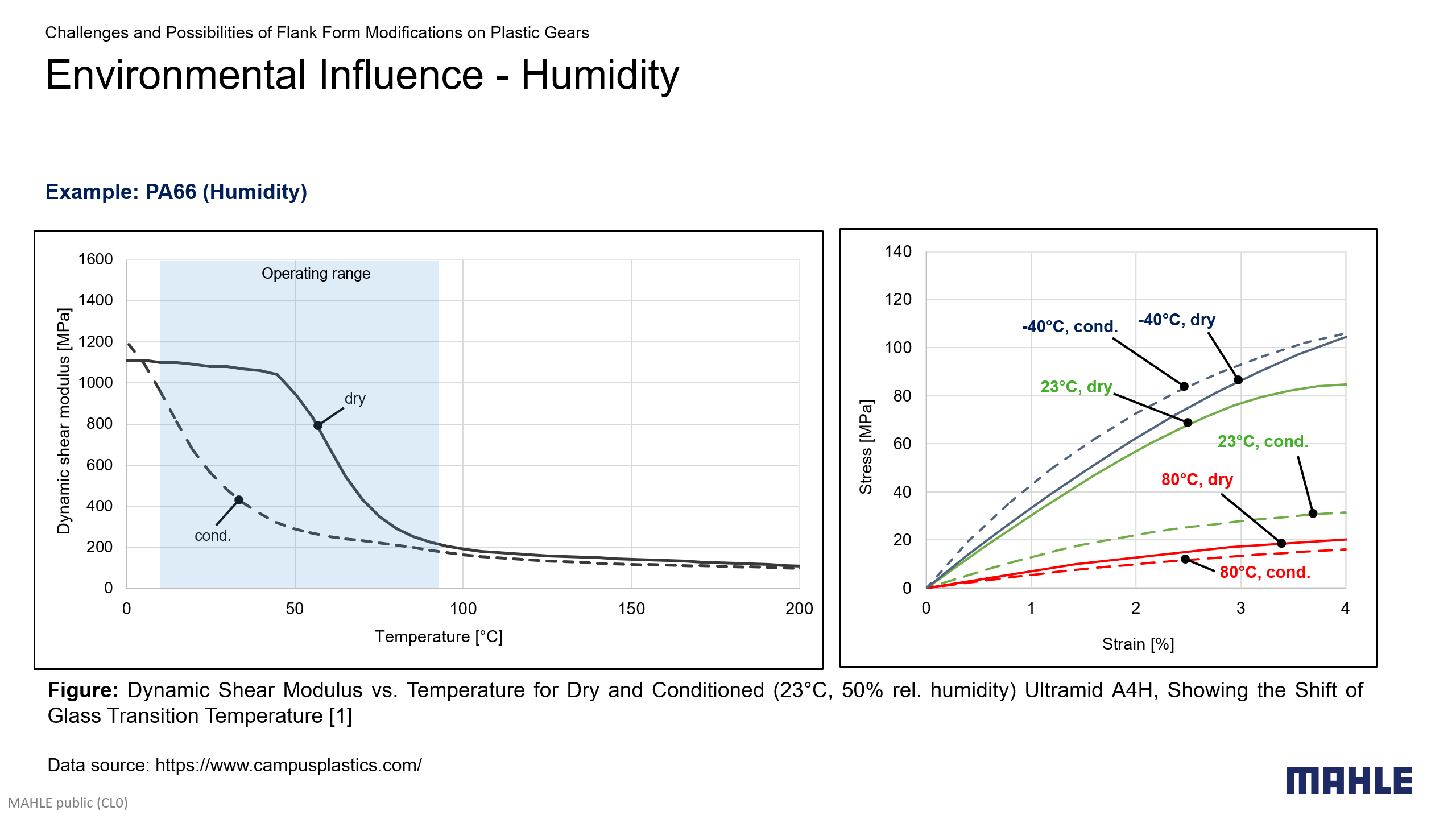 Furthermore, the temperature range in which the steep decline in shear modulus (due to glass transition) is observed shifts to lower temperatures. This is illustrated for PA66 for which the transition is shifted from approx. 50°C-70°C (dry state) to approx. 0°C-25°C (conditioned state). Thus, for 23°C the stress-strain curves differ significantly between the dry and the conditioned states. For cold temperatures (e.g. -40°C) or high temperatures (e.g. 80°C) the material is stable in either the hard or the soft regime and the differences in stiffness between dry and conditioned states become small. In fiber-reinforced plastics, anisotropic geometry changes due to swelling can affect the gear mesh, particularly in the case of different materials for pinion and wheel.
