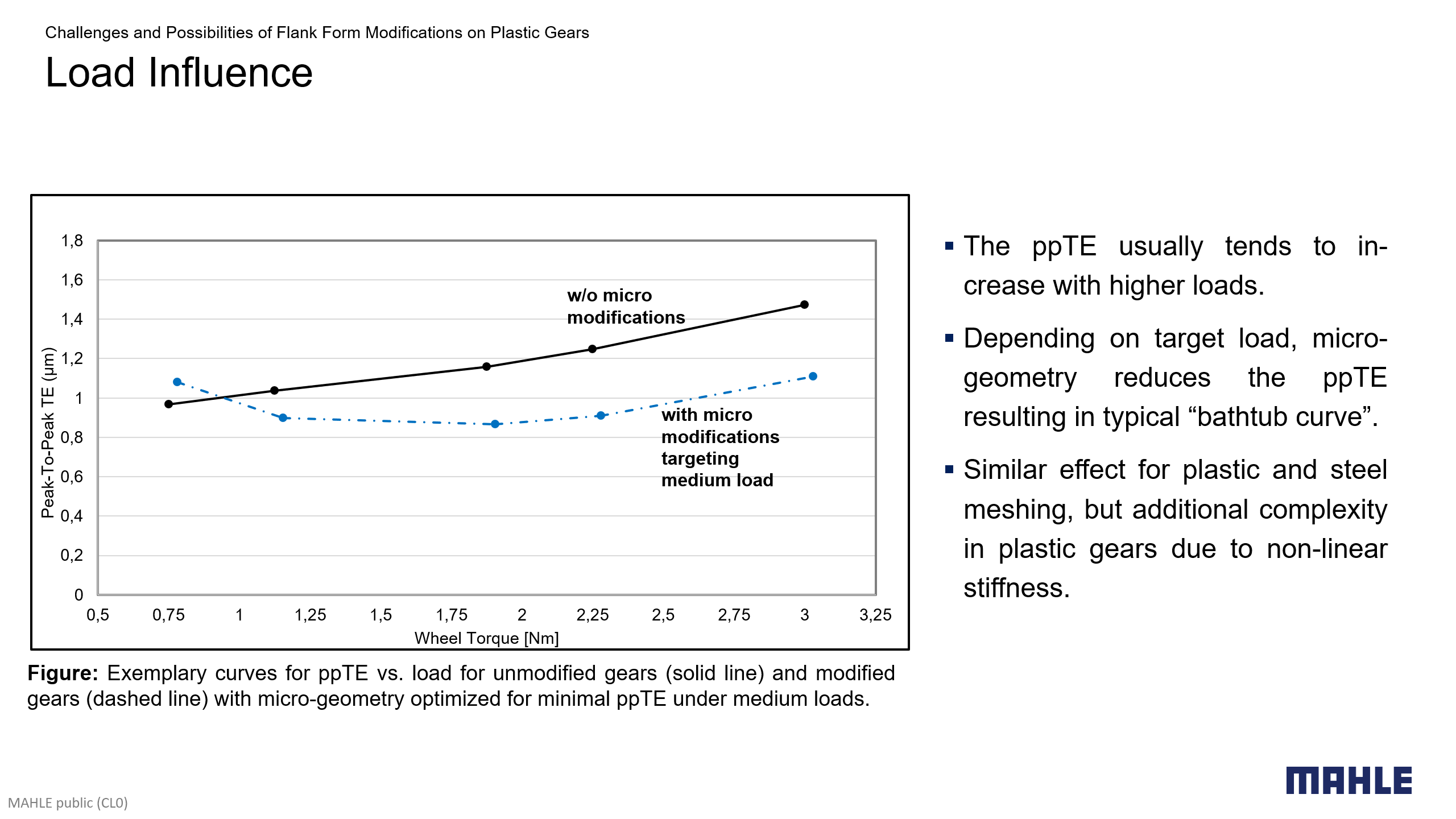 Applying torque causes deformations in the gear mesh which depend on the mesh stiffness. Mesh stiffness, in turn, is a function of the roll distance as the current actual number of teeth in contact and the lever arms of the contact forces vary along the path of contact. The smaller the variation in mesh stiffness the smaller the transmission error (TE). Any micro-geometry design can minimize TE only for one specific load. When considering multiple load levels, a compromise must be made. In the case of plastic gears, load dependence is even greater than with steel gears due to the material’s nonlinear stiffness, which exhibits a decreasing secant modulus as the load increases. Flank form modifications in plastic gears must therefore be designed in such a way that they are even more tolerant of load variations than steel gears. To achieve this, an optimal operating range (e.g., 2/3 of the maximum load) is defined, and a micro-geometry is designed accordingly. This results in a characteristic “bathtub curve” for transmission errors vs. load. The minimum of this curve can be shifted by adjusting the micro-geometry.