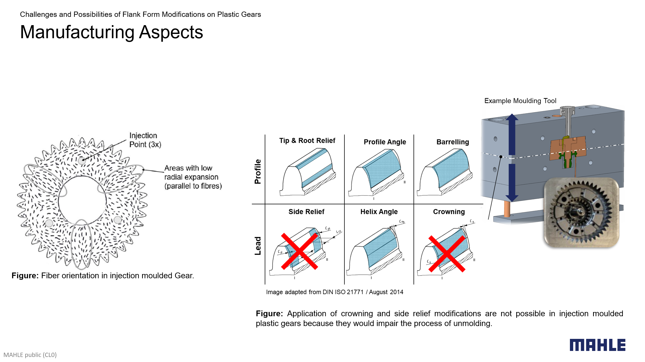 The manufacture of plastic gears using injection molding differs significantly from steel gear production in terms of the achievable accuracies and applicable flank form modifications. Injection-molded plastic gears typically achieve 3–4 quality levels lower than ground steel gears per ISO 1328-2013. Unreinforced plastic components achieve better qualities than fiber-reinforced ones. In short-fiber-reinforced, anisotropic plastics, thermal expansion is not uniform, leading to additional challenges: