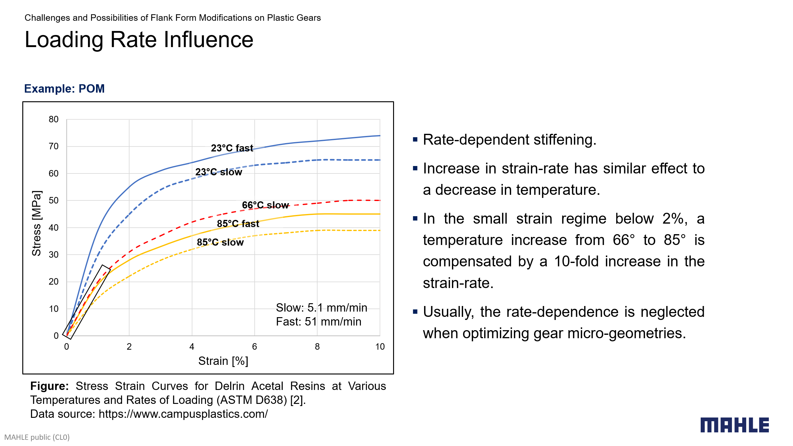 In steel gears, the influence of loading rate is negligible, whereas in plastic gears the speed of load (and deformation) increase or decrease has a significant impact due to the pronounced viscoelastic behavior of plastic materials. A higher loading rate (and deformation rate) has a stiffening effect which is similar to a temperature decrease. For example, the relevant secant moduli for small strain rates are nearly identical for 85°C at a deformation rate of 51 mm/min and 66°C at a rate of 5.1 mm/min. Micro-geometry design should therefore consider the rate-dependencys if necessary, although its effects are often minor compared to temperature changes in typical applications and can usually be neglected.