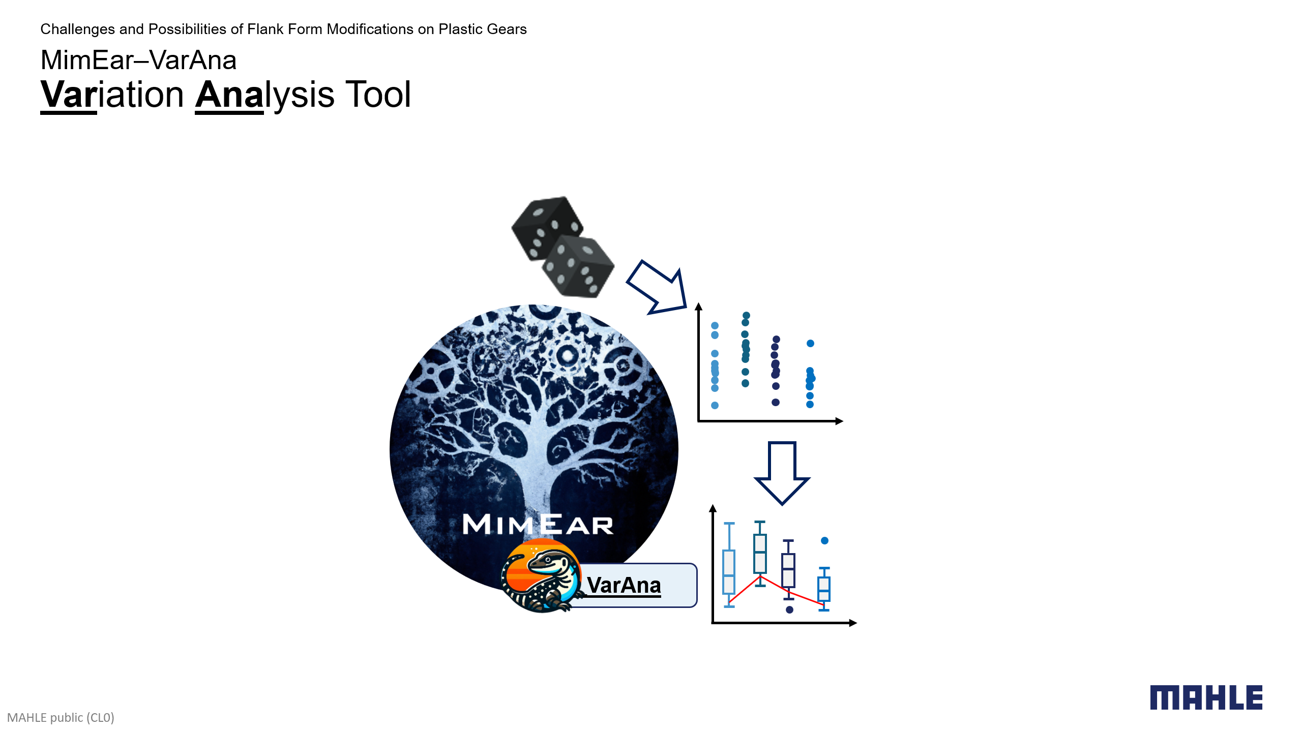 Certain micro-geometries, such as lead crowning, are limited in injection molding due to demolding requirements. The influence of tolerances can be captured through Monte-Carlo simulation. At MAHLE ZG Transmissions, the in-house MimEar module “VarAna” is used to evaluate and optimize micro-geometries under tolerance influences.