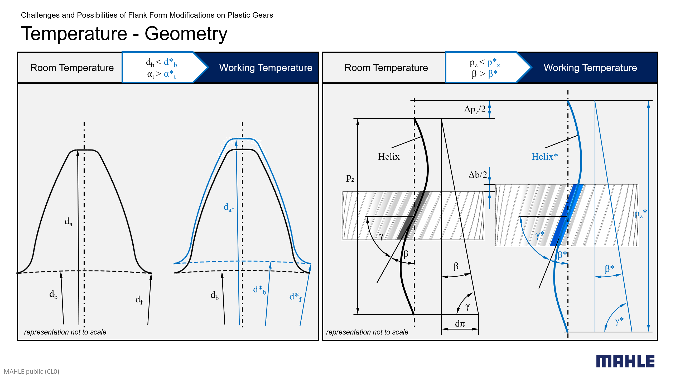 In metals, the change in Young’s modulus within the typical temperature range is negligible, whereas for plastics, it is significant. For example, the secant modulus of POM can decrease by a factor of 2.4 in the range from -40°C to 90°C [1; Delrin 100nc10]. Due to thermal expansion, temperature changes lead to geometric changes. In the case of identical materials for pinion and wheel the isotropic thermal expansion and contraction primarily affect the gear mesh via an apparent change of the center distance (provided the center distance is not similarly affected, which would compensate for the expansion of each individual part). In the case of different materials for pinion and wheel (e.g., steel to plastic), the expansions in the gear partners are unequal due to the higher thermal expansion of one partner relative to the other. This affects the actual base circle and the resulting involute curves through (assumed) homogeneous, isotropic thermal expansion of the entire gear. This leads to a change of the actual working pressure angle in the gear mesh. The axial expansion of a helical gear alters the helix pitch and, consequently, the helix angle on a defined diameter. When measuring a homogeneously and isotropically expanded gear on a CMM machine with respect to the nominal gear parameters, the measured profile and lead show deviations in both the profile angle and the helix angle, respectively.