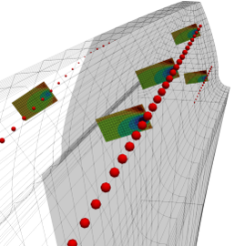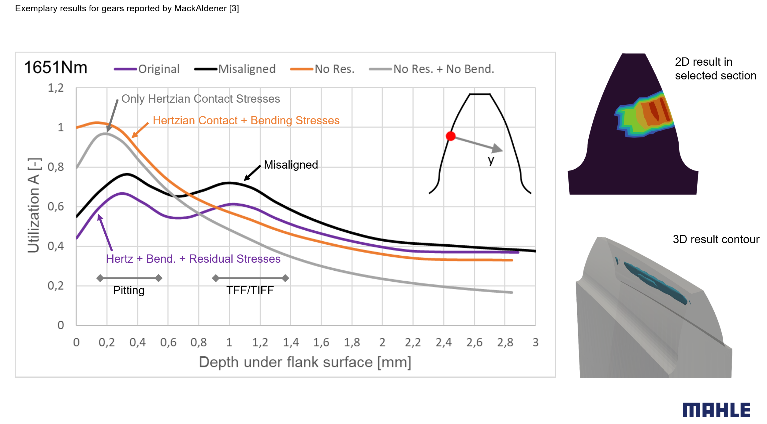 The material utilization is evaluated along the surface normals beneath each considered contact point and is mapped to the macro FE mesh. The residual stresses typically have a major influence on the results. Sites of high utilization in close proximity to the flank surface are at risk of pitting damage (contact fatigue). Tooth flank fracture and tooth interior fatigue fracture originate typically from deeper regions close to the case-core boundary. Critical regions may travel due to system deflection or manufacturing deviations. Owed to the 3D nature of our TFF method it is possible to present the precise location of the material volume with highest utilization. Also common 2D slices with colored contours can be generated.