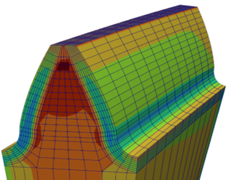 3D-Macro model: The macroscopic 3D stresses from case hardening and tooth bending are evaluated on a reasonably coarse 3D FEM mesh of a single tooth. The residual stresses from case hardening are obtained from the prescribed transformation strain profile normal to the gear surface. The required stress-history from tooth bending is obtained from consecutive solutions of the macro FE model subjected to the contact forces of each loaded contact line.