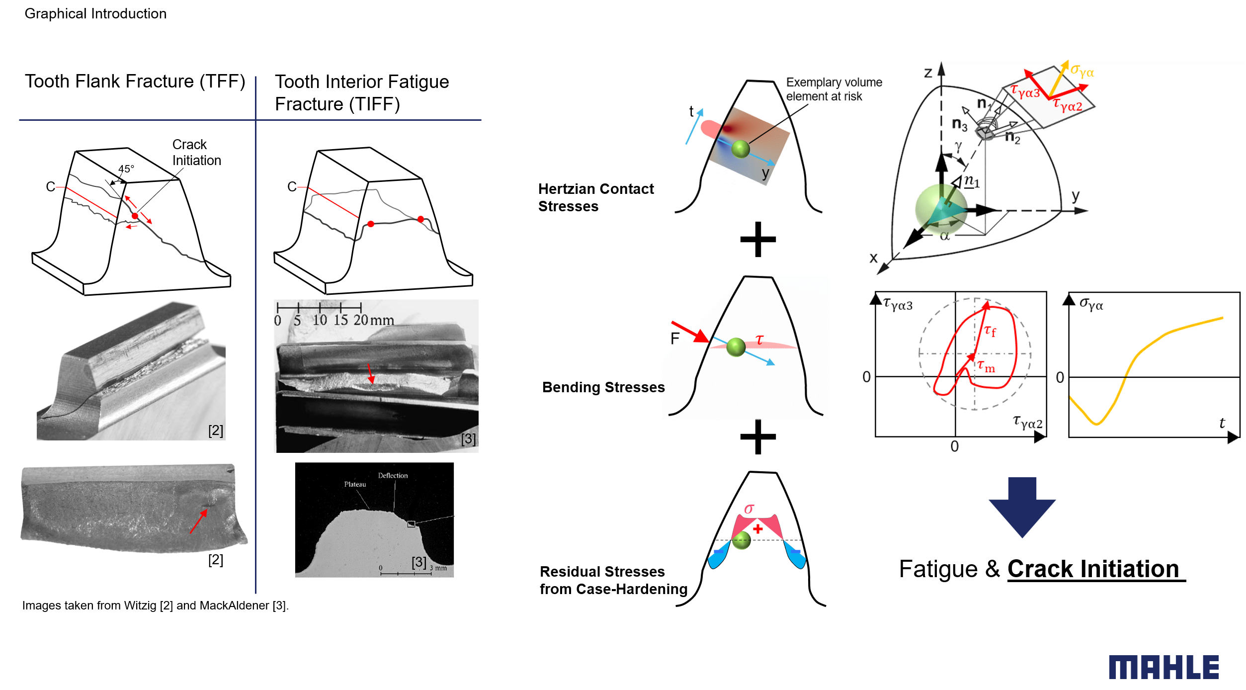 Tooth flank fracture (TFF) and tooth interior fatigue fracture (TIFF) are two related types of failure. Typical examples are documented, e.g., by Witzig [2] and MackAldener [3]. TFF occurs in gears with single flank loading, whereas TIFF is predominantly found in idler gears which are loaded on both tooth flanks. Despite the different damage phenomenologies the underlying material mechanical root cause for crack initiation is the same for both damage types. The material in the interior of a loaded tooth is stressed by the dynamic contributions from Hertzian contact and from tooth bending, as well as by the static residual stresses resulting from case hardening. In any arbitrarily oriented plane around any material point the time histories of the shear and normal stress cycles can be evaluated. These dynamic stresses fatigue the material and may lead to the formation of a tooth internal crack. The compressive residual stresses near the surface of case -hardened gears have a positive effect on the durability, but lead to tensile stresses in the core. TFF & TIFF are often initiated close to the case/core-boundary where the negative effects of tensile residual stresses and increased shear stresses from tooth bending act together.