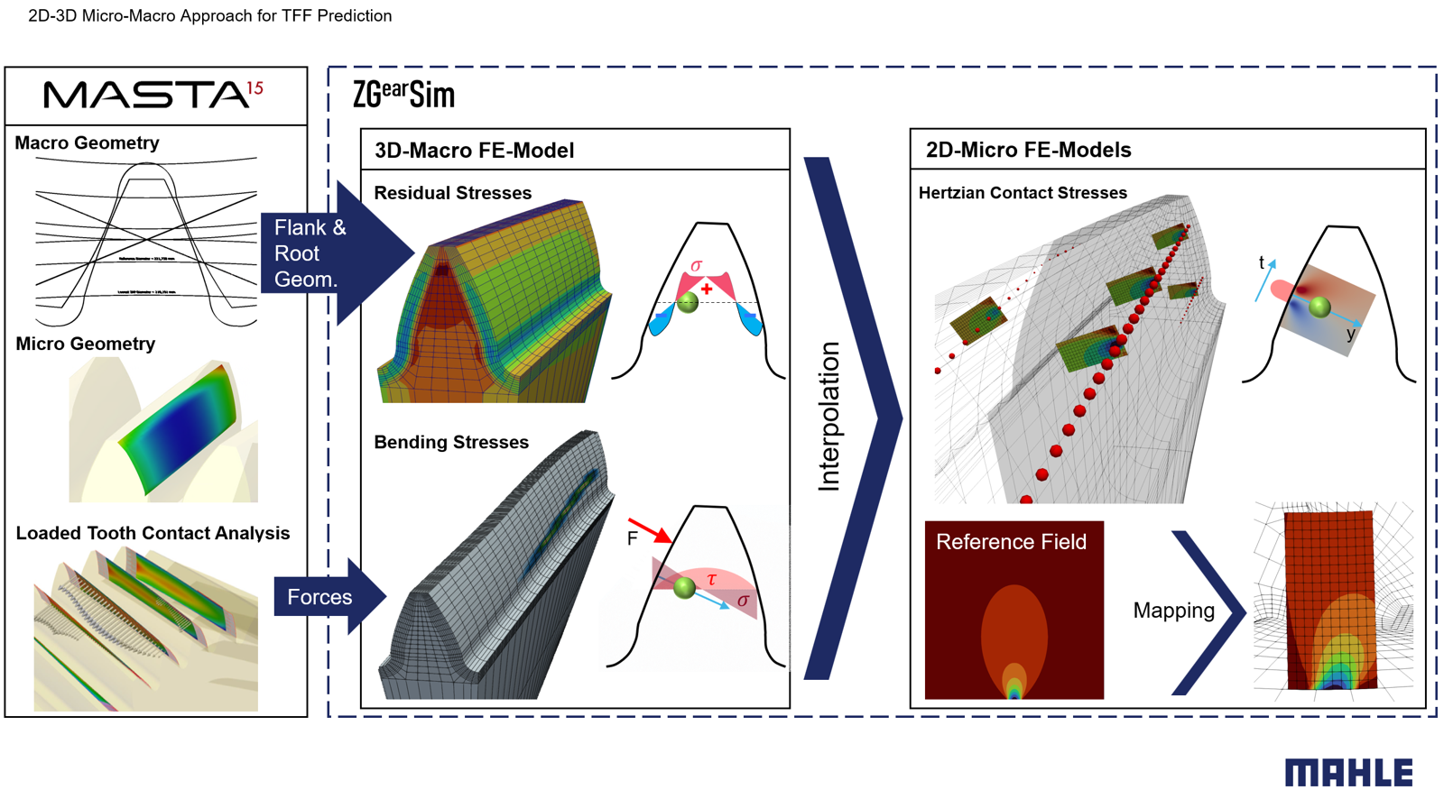 Available computational methods for TFF prediction are 1D/2D, since a full 3D analysis of the tooth contact and the stress history in the tooth interior is not feasible in practical applications. However, certain effects can only be captured in 3D. Therefore, we suggest a novel computational method which efficiently incorporates the 3D physics by leveraging a mixed-dimensional multi-scale approach. An important aspect of our method is the interface to SMT's MASTA software (link). Masta's efficient Loaded Tooth Contact Analysis (LTCA) eliminates the need for a complex detailed FE contact analysis, with only minimal loss of accuracy [1]. MASTA enables the modelling of the whole transmission system and the evaluation of the system deflection under load which is fed to the LTCA as boundary condition. This allows to incorporate the effect of deformation and manufacturing deviations on the contact stresses and consequently on the risk of TFF/TIFF.