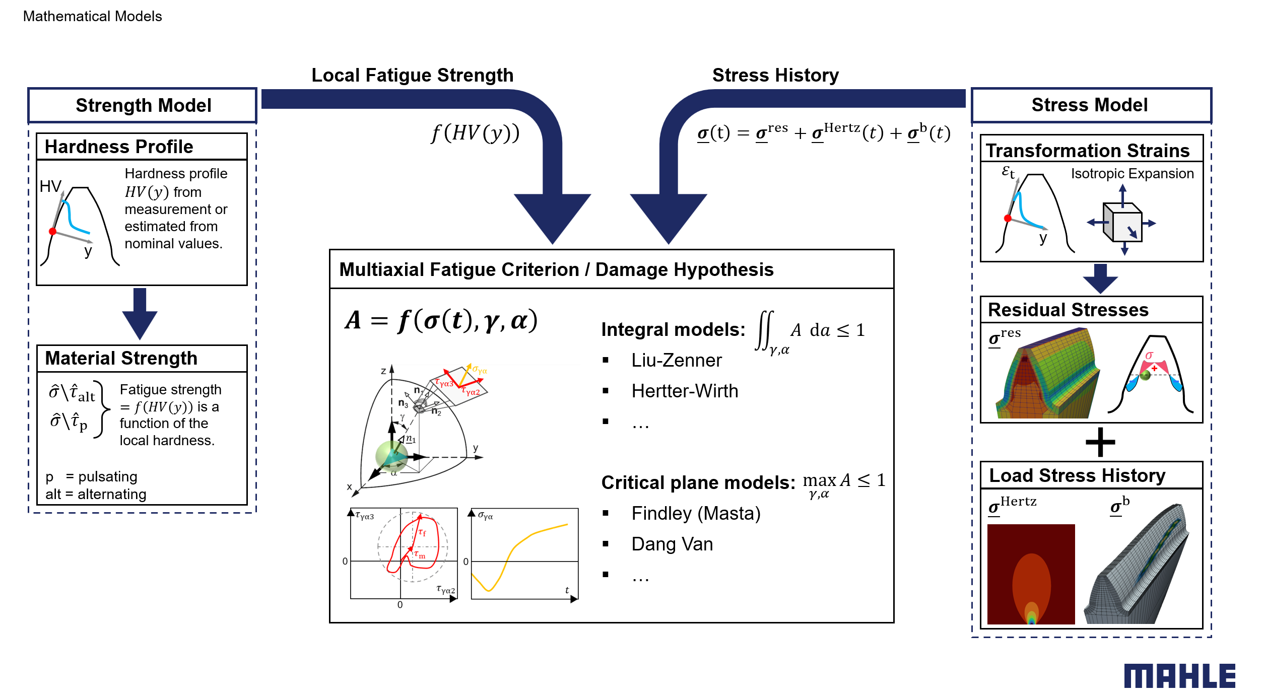 The strength model relates the fatigue limits for alternating and pulsating shear and normal stresses to the local hardness values underneath the gear surface. The hardness profile normal to the surface may be measured or estimated by well-known models such as those by MackAldener, Lang, or Thomas [3,4]. The stress model assumes linear superposition of the static residual stresses and the dynamic stresses from tooth bending & contact.